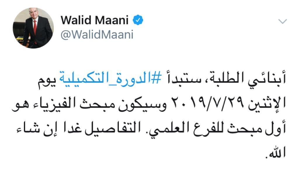 [size=5]وأعلن المعاني خلال تغريدة نشرها في حسابه الشخصي على موقع التواصل الاجتماعي "تويتر" أن مبحث الفيزياء سيكون هو أول مبحث للفرع العلمي.