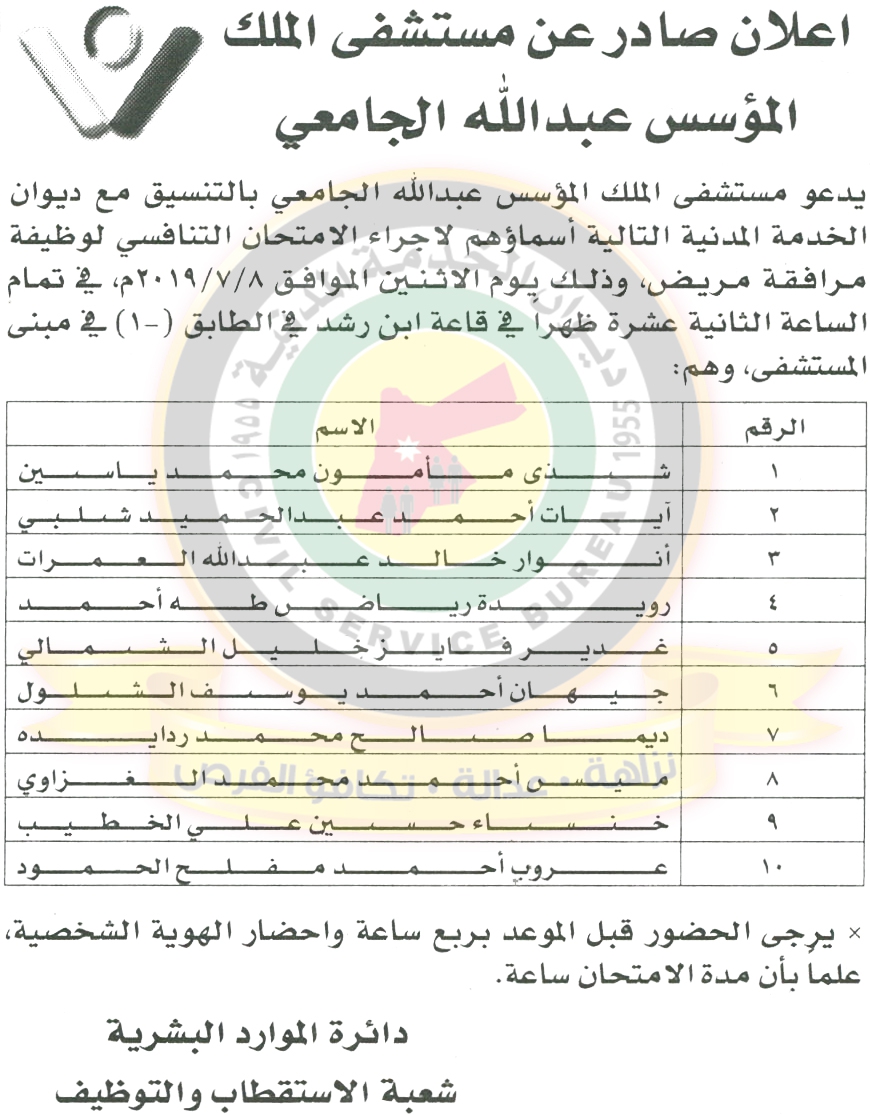 اعلان عن موعد اجراء الامتحان التنافسي للتعيين بوظيفة مرافقة مريض صادر عن مستشفى الملك المؤسس عبدالله الجامعي وبالتنسيق مع ديوان الخدمة المدنية