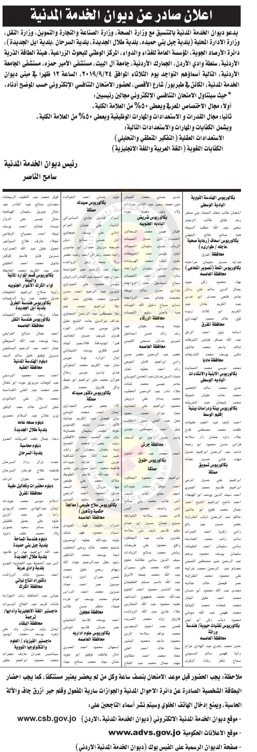 اسماء الناجحين في الامتحانات التنافسية لديوان الخدمة المدني شهر 6 و شهر 7 2019