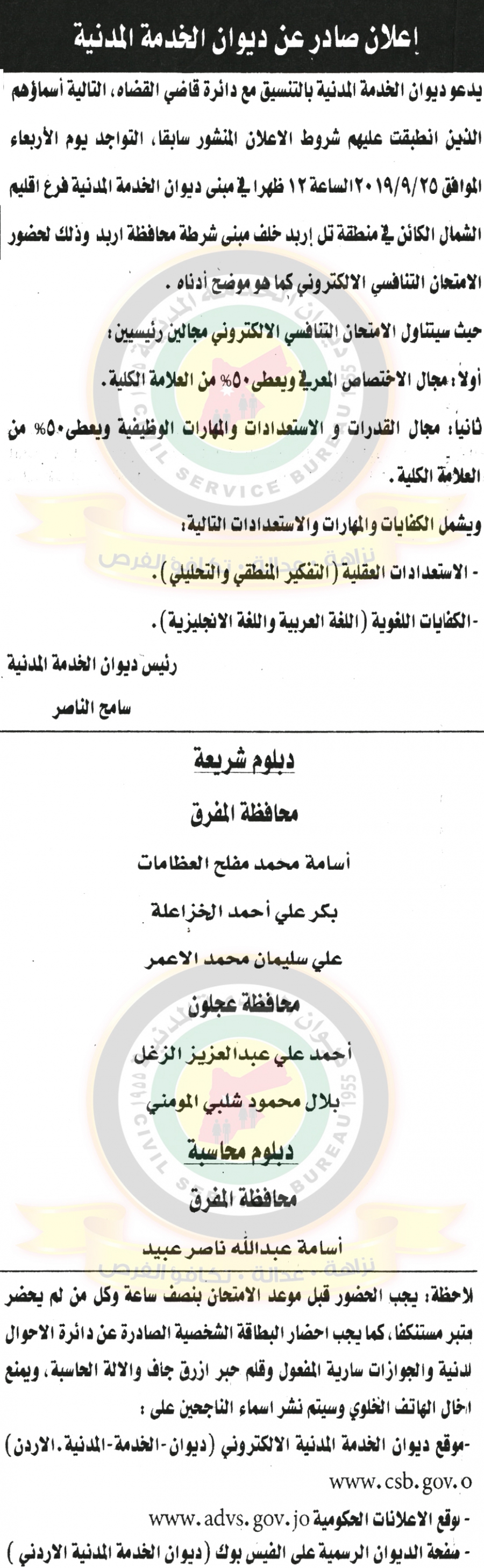 اسماء المدعوين لحضور الامتحان التنافسي الالكتروني يوم الأربعاء الموافق 25-9-2019