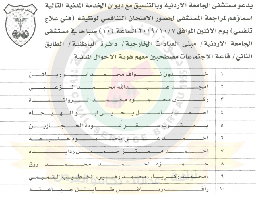 أسماء المدعوين للامتحان التنافسي في مستشفى الجامعة الاردنية بتاريخ 7/10/2019
