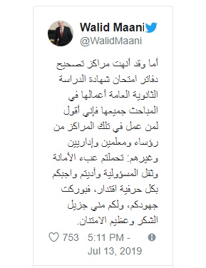[face=arial]<font size="5">وقال في تغريدته "أما وقد أنهت مراكز تصحيح دفاتر امتحان شهادة الدراسة الثانوية العامة أعمالها في المباحث جميعها فإني أقول لمن عمل في تلك المراكز من رؤساء ومعلمين وإداريين وغيرهم: تحملتم عبء الأمانة وثقل المسؤولية وأديتم واجبكم بكل حرفية اقتدار، فبوركت جهودكم، ولكم مني جزيل الشكر وعظيم الامتنان".[/face]