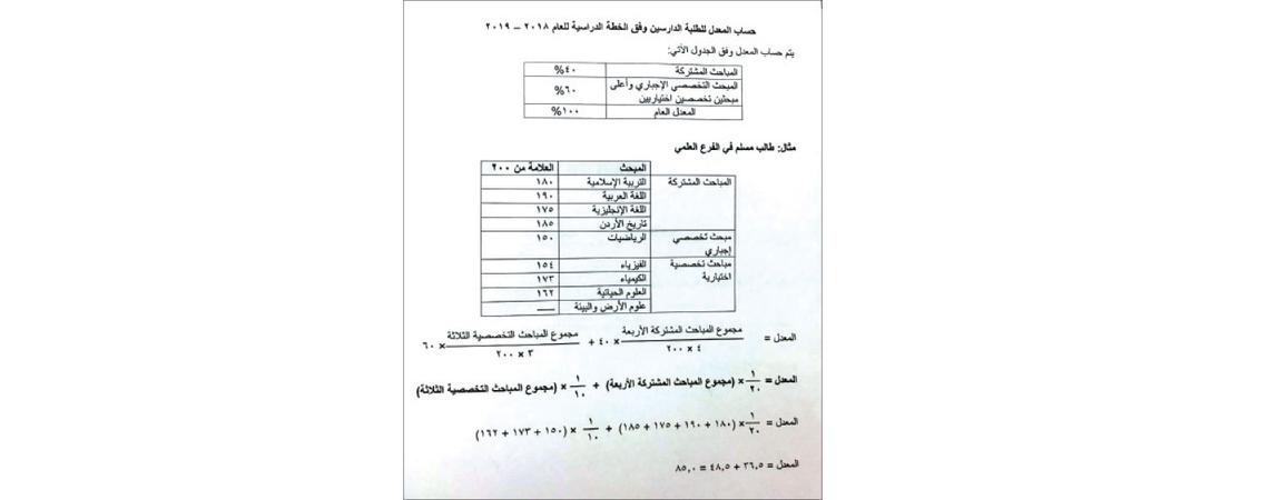 اوضح مدير إدارة الامتحانات في وزارة التربية والتعليم الدكتور نواف العجارمة طريقة احتساب المعدل العام لطلبة شهادة الدراسة الثانوية العامة، وفق الخطة الدراسية المعتمدة للعام 2019/2018.