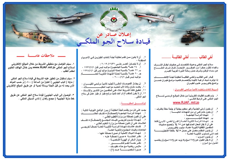 1. سيتم التواصل مع منطبقي الشروط من خلال الموقع الإلكتروني لسلاح الجو الملكي RJAF.mil.jo ،ومن خلال الهاتف الخلوي لمقدم الطلب.
