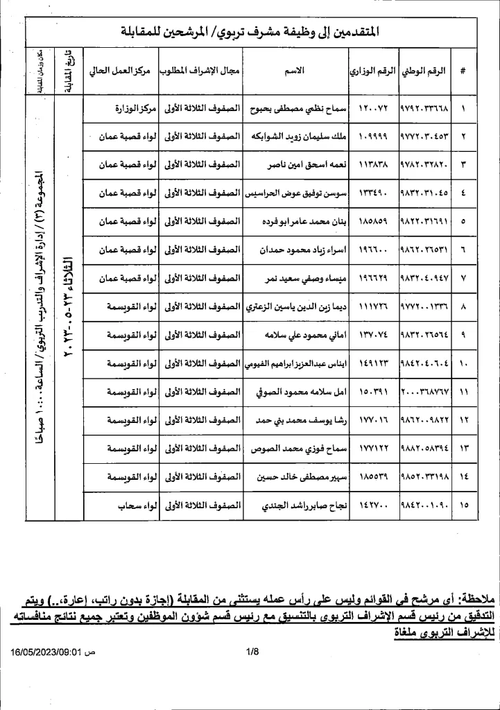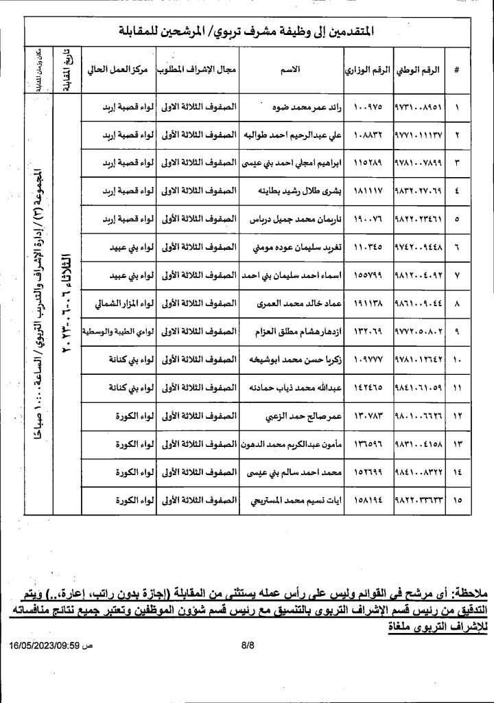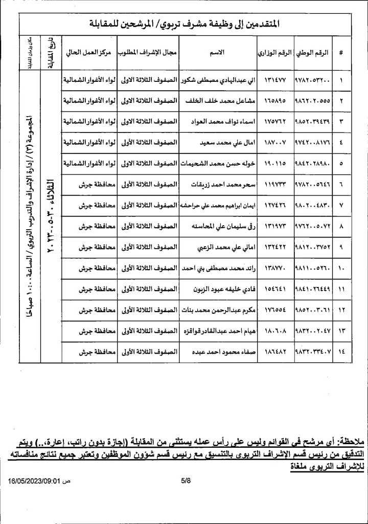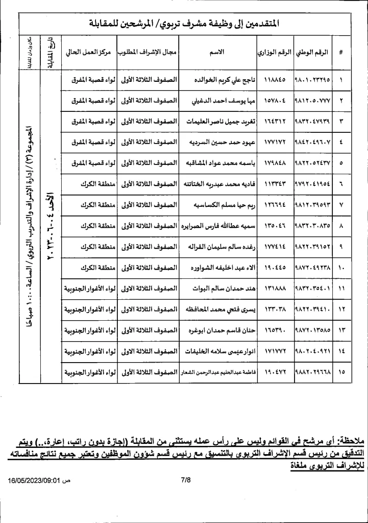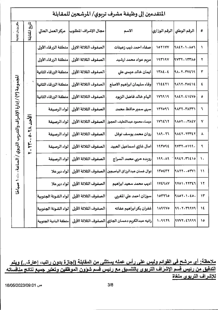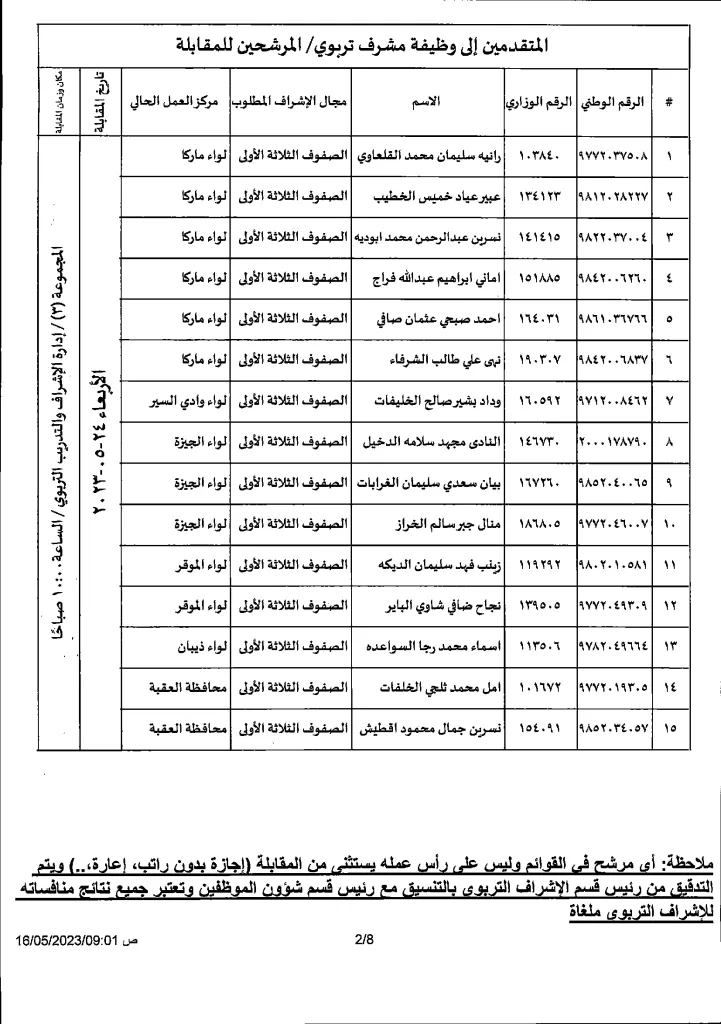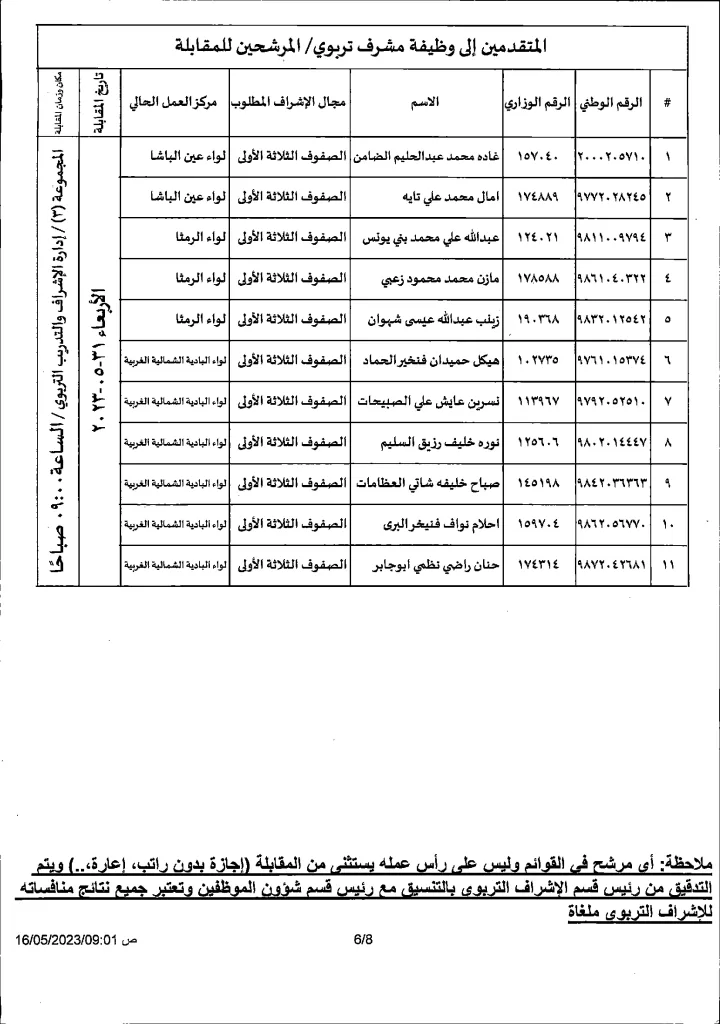 اصدرت التربية المقابلات الشخصية لوظيفة مشرف تربوي من الذين اجتازو الورشة التقيمية بنجاح وتاليا اسماء المرشحين مع الموعد المحدد لة ونبهت التربية بضرورة الالتزام بالحضور في الزمان والمكان المحددين في الجدول المرفق في حال الاستنكاف عن الحضور يعتبر فاقدا لحقة وتاليا الاسماء : تم ارفاق الاسماء مباشره او بالاسفل يمكنك تحميلها ملف بي دي اف