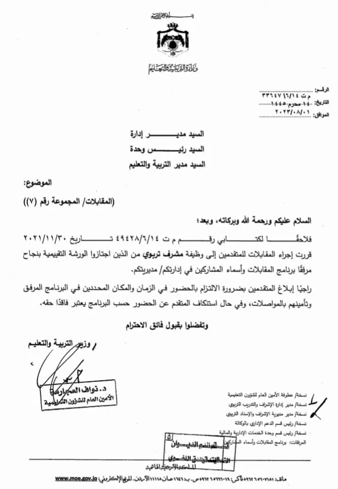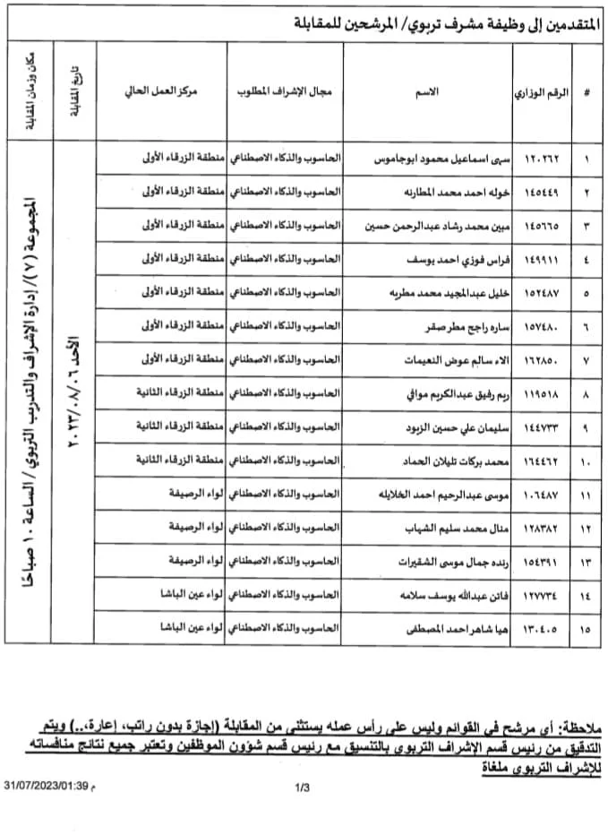 اصدرت التربية اسماء المتقدميين الى وظيفة مشرف تربوي من الذين اجتازوا الورشة التقييمية بنجاح وتاليا اسماء برنامج المقابلات واسماء المشاركين في مديريات والادارات مع ضرورة الالتزام بالزمان والمكان المحدديين في المبرنامج ومن يتغيب يعبر فاقدا لحقة وتاليا الاسماء :