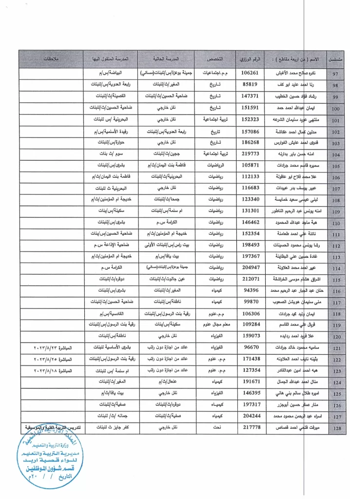 التنقلات الداخلية مديرية تربية قصبة اربد 2023 احباب الاردن سنتين ago التنقلات الداخلية مديرية تربية قصبة اربد 2023 اصدرت مديرية تربية قصبة اربد التنقلات الداخلية وتحديد مراكز العمل وتاليا بالمرفق الاسماء والمراكز بالتوفيق للجميع :