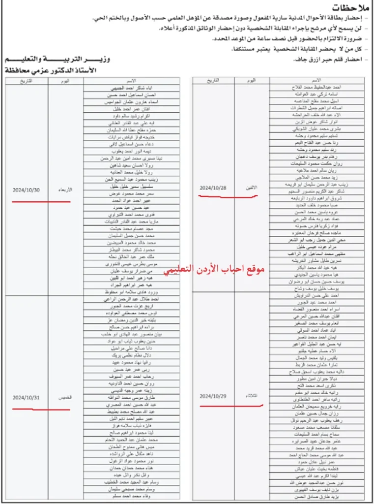 دعت وزارة التربية والتعليم المرفقة اسمائهم بالاسفل والذين تم اختيارهم لاعلى العلامات في الامتحانات التنافسية ممن تقدمو خلال الاعلان المفتوح لاجراء المقابلات الشخصية التواجد في مركز وزارة التربية والتعليم في قسم التوظيف في العاصمة عمان منطقة العبدلي بجانب مسجد الشهيد الملك المؤسس عبدالله بن الحسين ابتداء من الساعه التاسعة وحسب المواعيد المبينة ازاء اسم كل منهم وتاليا اسماء وتعليمات المقابلة بالتوفيق للجميع : للوظائف الادارية في التربية