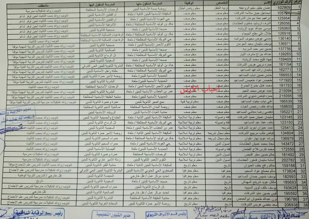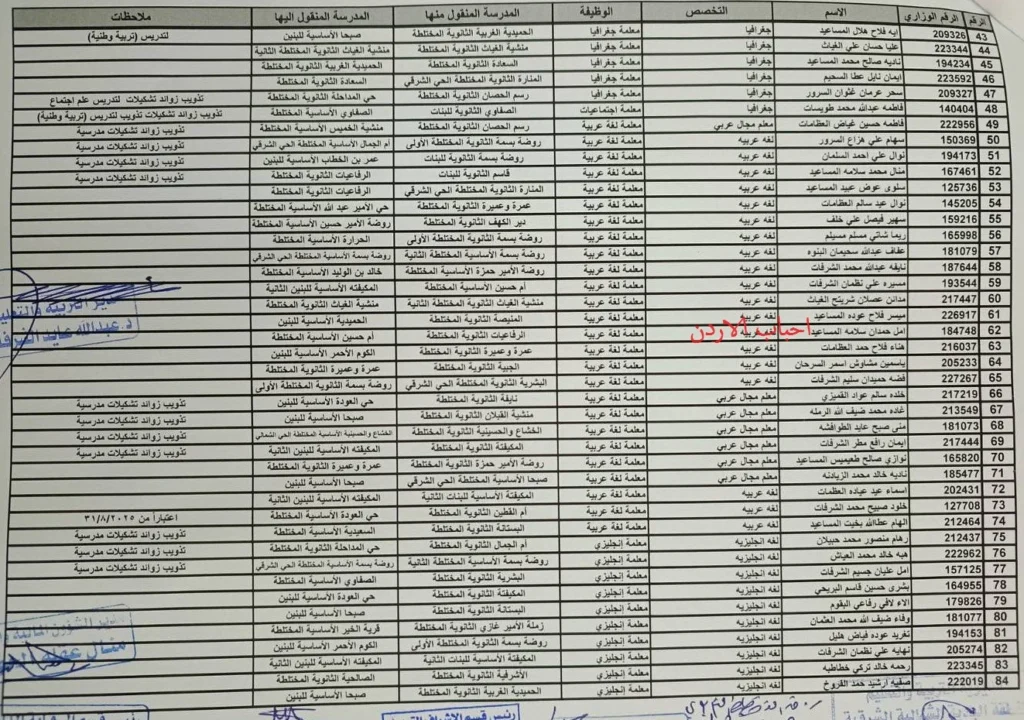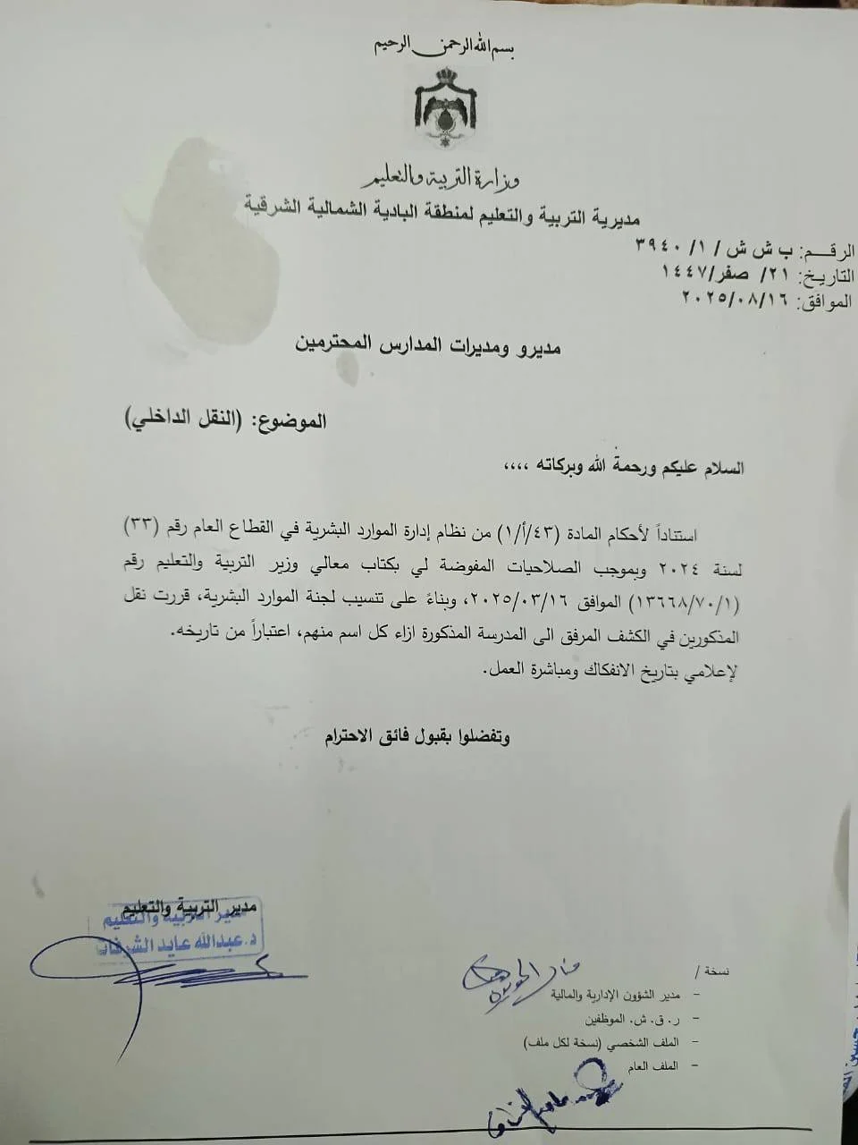 اصدرت مديرية تربية البادية الشمالية الشرقية التنقلات الداخلية 2025/2026 لعدد من موظفيها كما في المرفقات التالية بالتوفيق للجميع :