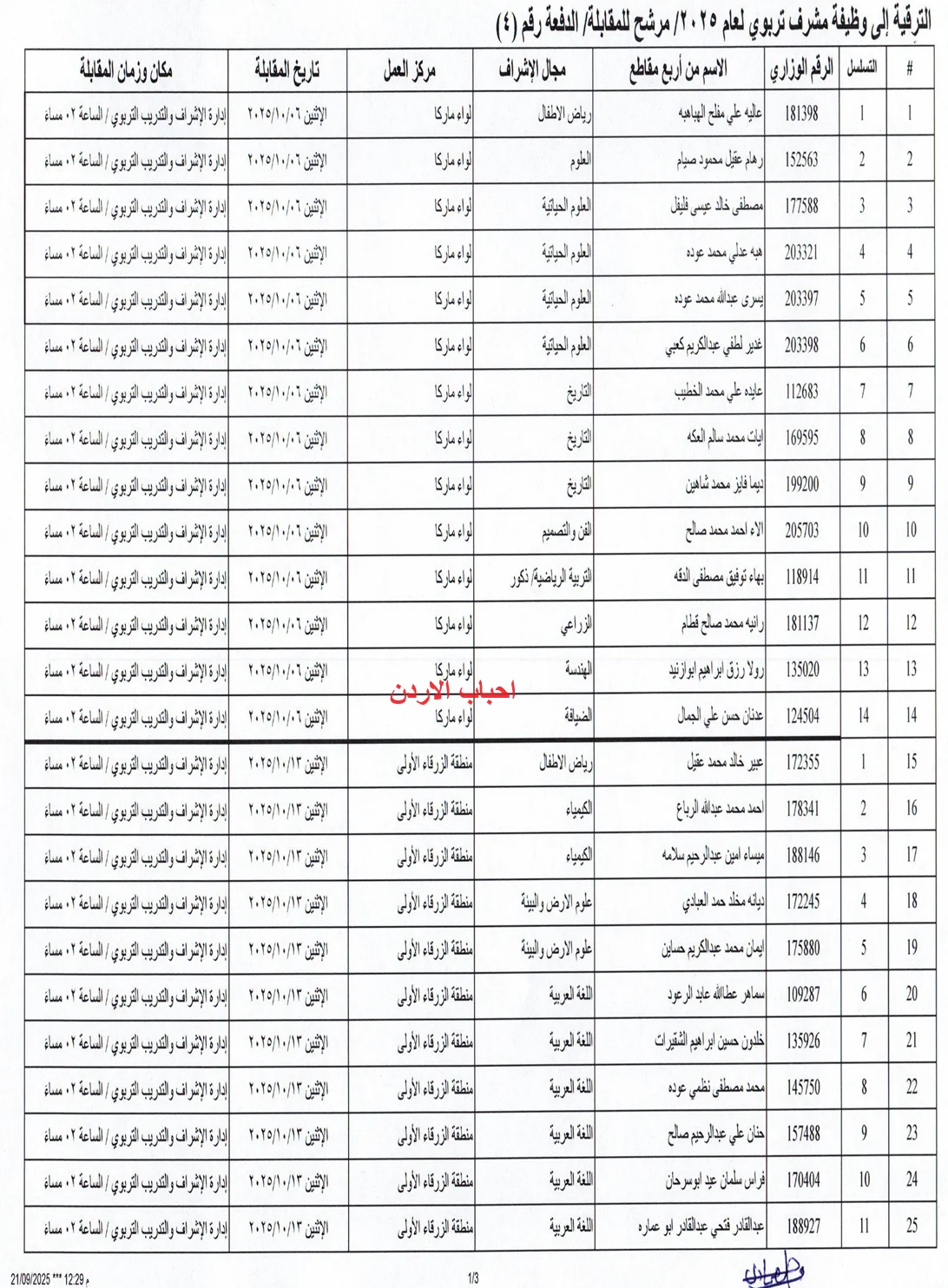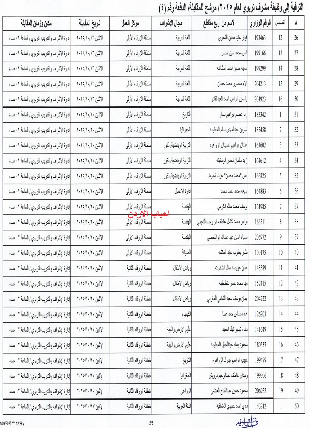مقابلات مشرف تربوي اخصائي مبحث الدفعة الرابعة 2025 احباب الاردن شهر واحد ago مقابلات مشرف تربوي اخصائي مبحث الدفعة الرابعة 2025 قررت التربية اجراء مقابلات شخصية لوظيفة مشرف تربوي اخصائي مبحث من الذين اجتازو الامتحان بنجاح تاليا مرفق اسماء والمواعيد توفيق للجميع :