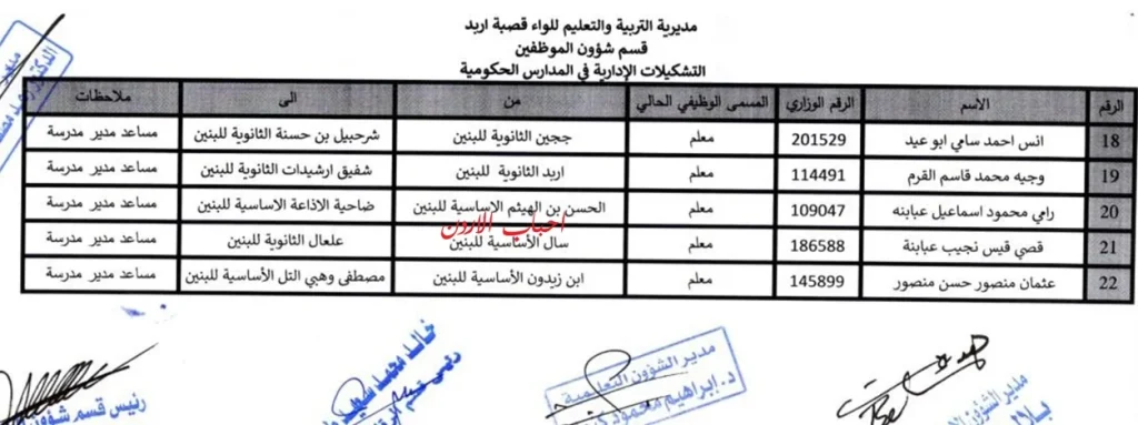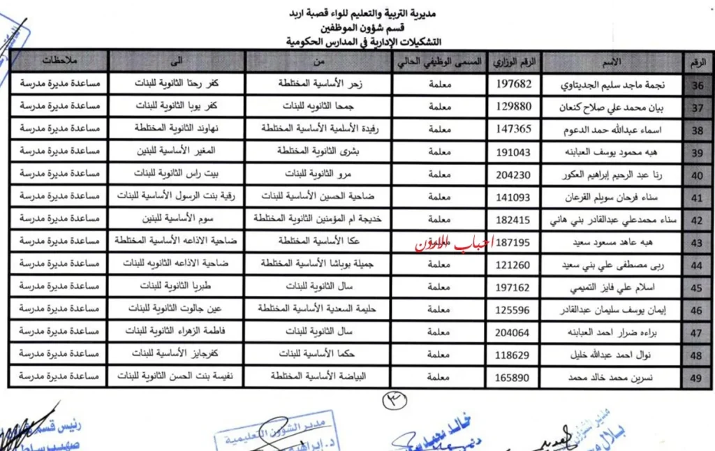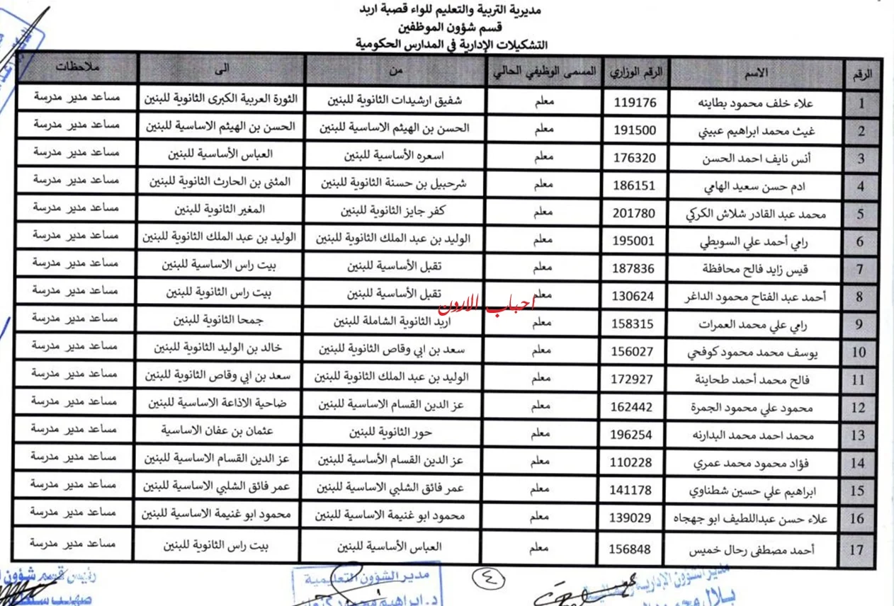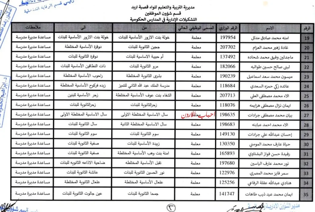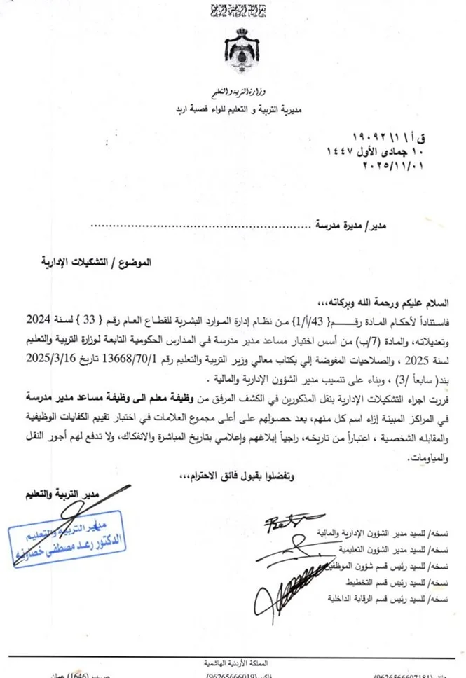 تشكيلات واسعة لنقل لوظيفة مساعد مدير تربية قصبة اربد 2025