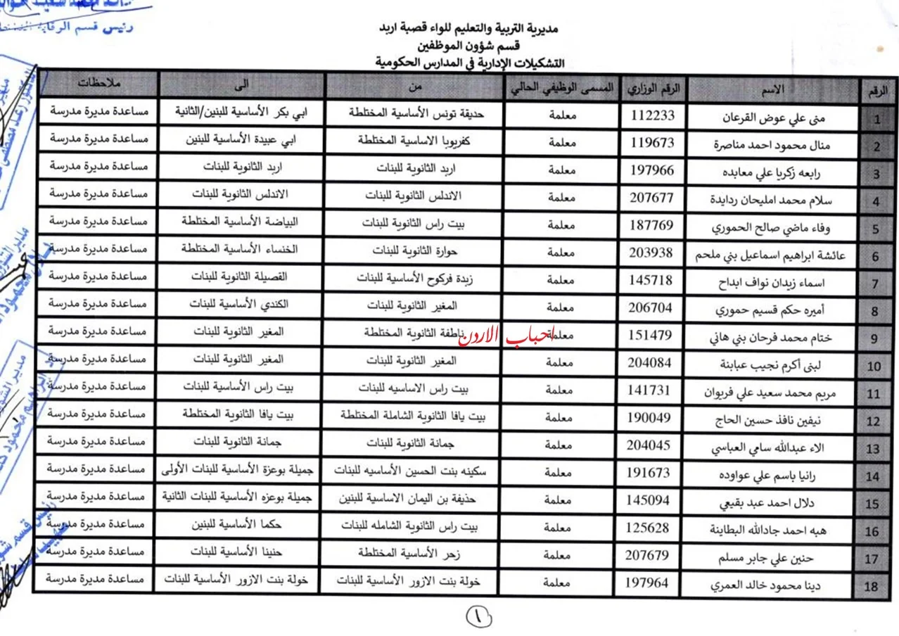 اصدرت تربية قصبة اربد عدد من التشكيلات الادارية لنقل لوظيفة مساعد مدير مدرسة لعدد من موظفيها وتاليا نص التعميم والاسماء بالتوفيق للجميع بالوظائف الجديده :