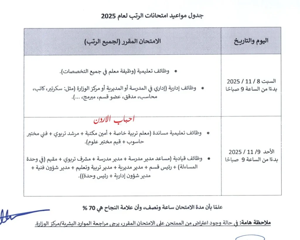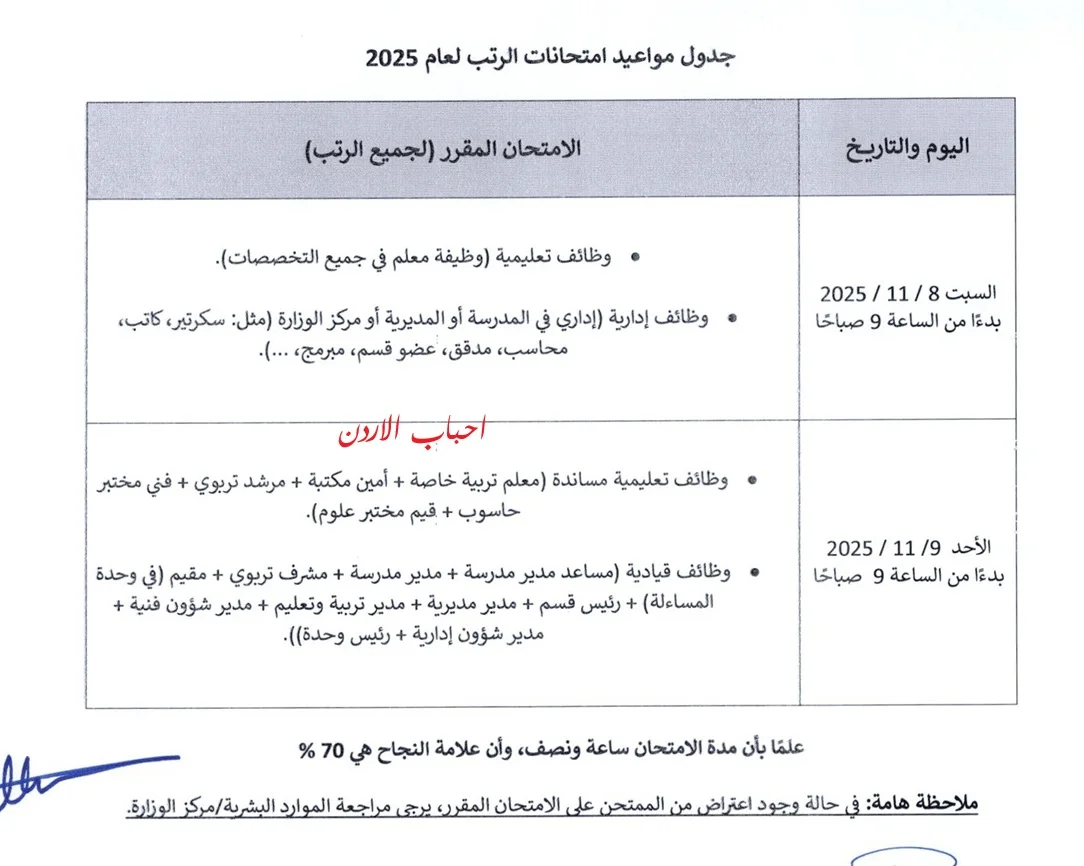 قررت التربية عقد امتحانات الرتب في مراكز امتحانات برامج التنمية المهنية التابعة للمديريات حسب المرفق الاسماء بالاسفل باللون الاخضر واحضار وصل للغائبين والراسبين بالامتحانات السابقة بقيمة خمس دنانير لحساب امانات الدورات علما ان مده الامتحان ساعة ونصف وتاليا مرفق التعميم والتعليمات والاسماء مرفقة بملف بالاسفل بالتوفيق للجميع :