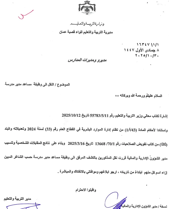 تعيينات نقل لوظيفية مساعد مدير تربية قصبة عمان 2025 احباب الاردن 7 ساعات ago تعيينات نقل لوظيفية مساعد مدير تربية قصبة عمان 2025 اصدرت تربية قصبة عمان نقل لوظيفة مساعد مدير لعدد من موظفيها كما في التعميم المرفق تاليا الف مبارك للجميع :