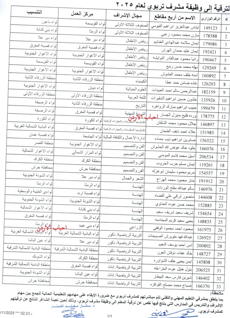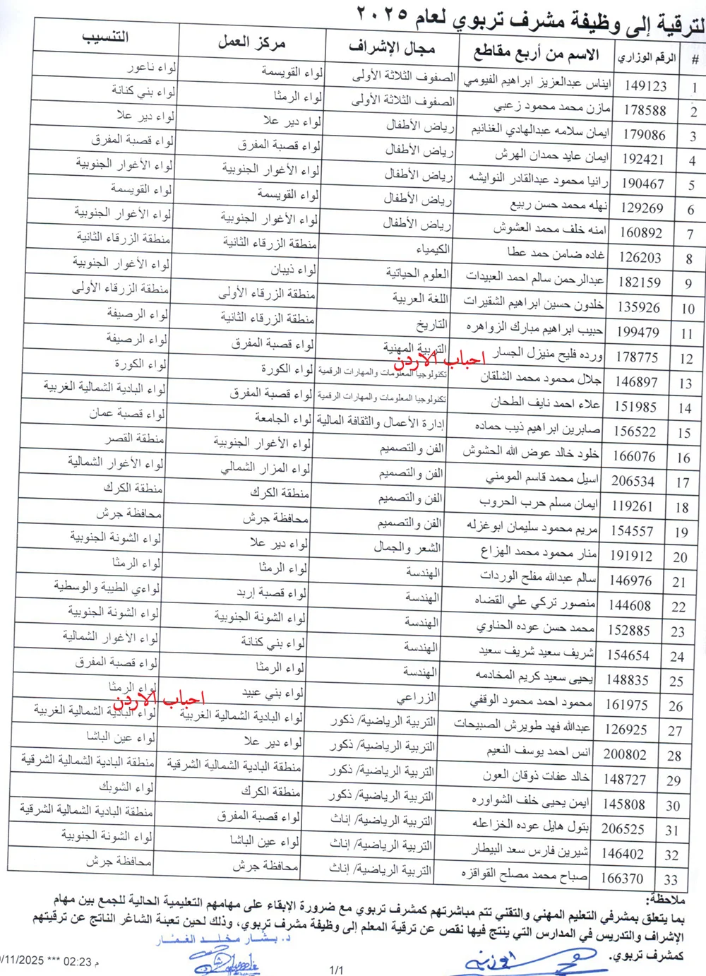 فاستنادًا لأحكام المادة (41) من نظام إدارة الموارد البشرية في القطاع العام رقم (33) لسنة 2024 وتعديلاته، اصدرت التربية عدد من الترقيات في الكشف المرفق إلى وظيفة مشرف تربوي/ أخصائي مبحث في مجال الإشراف في المديرية المبينة إزاء اسم كل منهم اعتبارًا من تاريخه، الصادر بترايخ 23/11/2025 وتاليا كشف مرفق التعميم :