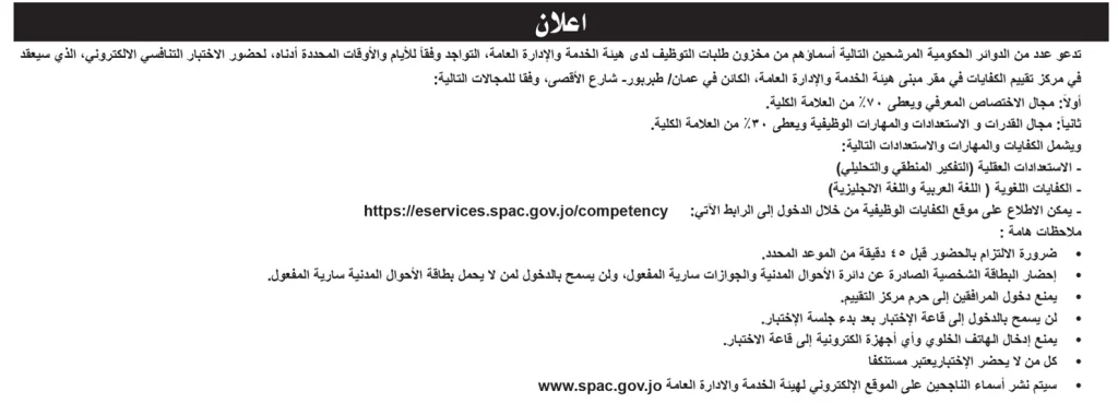 دعت عدد من الدوائر الحكومية المرشحين التالية أسماؤهم من مخزون طلبات التوظيف لدى هيئة الخدمة والإدارة العامة، التواجد وفقاً للمواعيد والأوقات المحددة أدناه، لحضور الاختبار التنافسي الإلكتروني، الذي سيعقد في مركز تقييم الكفاءات في مقر مبنى هيئة الخدمة والإدارة العامة الكائن في عمان/ طبربور/ شارع الأقصى، وفقاً للمجالات التالية: