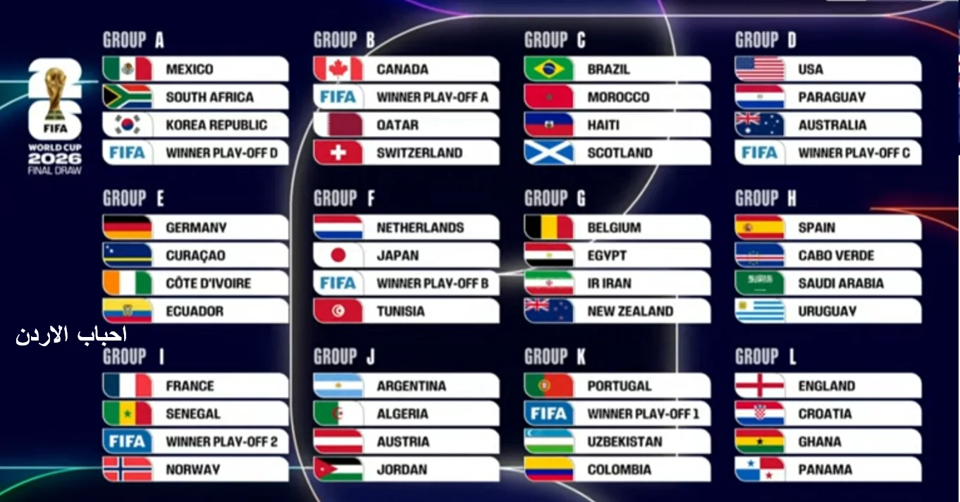ارفق لكم نتائج قرعة كاس العالم 2026 الت جرت اليوم الجمعة 5/12/2025 لتحديد مجموعات تصفيات كاس العالم وكانت المجموعات حسب الجداول التالية بالتوفيق للجميع المنتخبات العربية وخصوصا منتخب النشاما :
