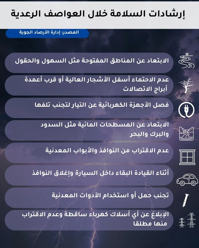 وبينت الأرصاد الجوية أن على المواطنين الابتعاد عن الأماكن المرتفعة والسهول المكشوفة؛ حرصا على سلامتهم، وعدم الوقوف قرب الأشجار المنفردة أو أعمدة الكهرباء والاتصالات، والابتعاد عن المسطحات المائية والمسابح والأماكن المكشوفة، وأن يبقى المواطن داخل مركبته إذا كان يقودها خلال حدوث ظاهرة الرعد والبرق، وتجنب ملامسة الأجزاء المعدنية، وعند وجوده داخل المباني والمنازل إغلاق النوافذ والأبواب بإحكام، والابتعاد عن الأجهزة الكهربائية والأسلاك، وتجنب استخدام الهواتف السلكية والمياه عبر “الدش والحنفيات” أثناء العاصفة.